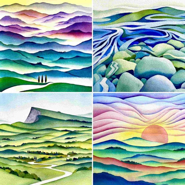 Contemporary, vibrant watercolour paintings inspired by nature and New Zealand landscapes. Visitors welcome.