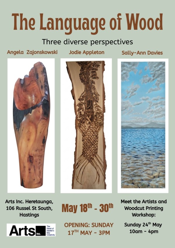 Three Diverse Perspectives is a collaborative exhibition that brings together three female artists whose practices are centered on wood as a material, a metaphor, and a storyteller. Sally-Ann Davies - woodcut printing, Angela Zajonskowski - creative woodturning, and Jodie Appleton - pyrography, as ways of revealing identity, belonging, and kaitiakitanga.